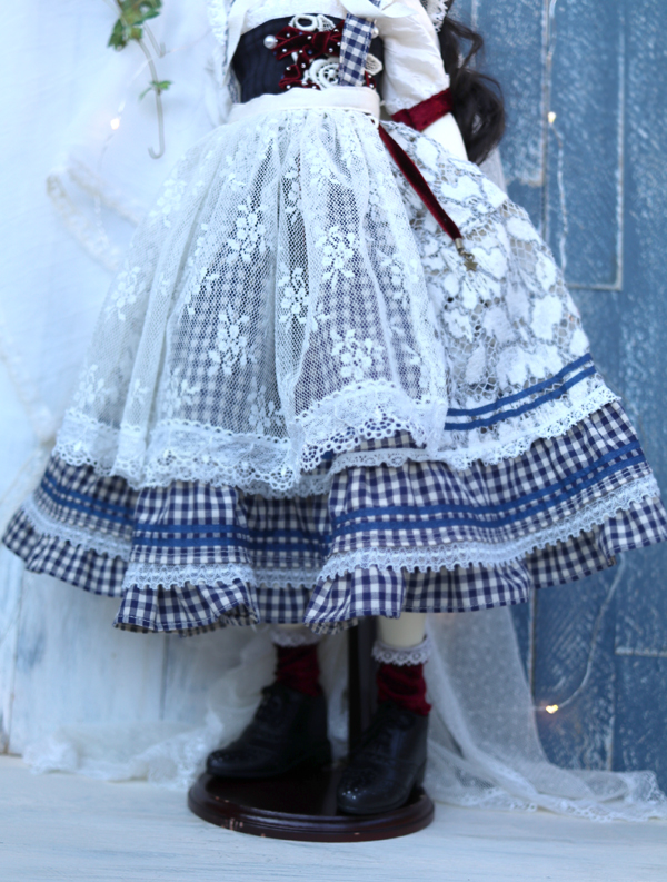 ブラウスは前ボタン留め、スカートは後ろでリボンで編み上げて着用して頂くタイプです。